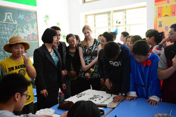 隨后,Emily校長觀看了學(xué)生書法、國畫、勾勒臉譜的現(xiàn)場演示,對于中國傳統(tǒng)文化表現(xiàn)出濃厚的興趣。同學(xué)們把各自作品送給Emily校長作為紀(jì)念,Emily愉快地接受,并與同學(xué)們開心地與同學(xué)們合影。
