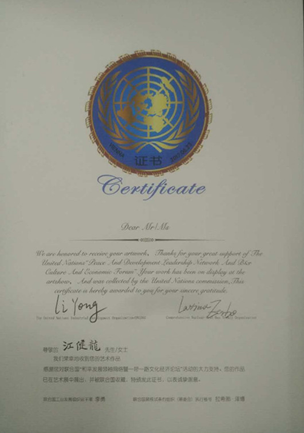 近年來,安徽新華學(xué)院鼓勵(lì)并支持廣大教師積極參加國內(nèi)外各類活動(dòng)。此次論壇中,江健龍作品入選聯(lián)合國“和平發(fā)展領(lǐng)袖網(wǎng)絡(luò)暨‘一帶一路’文化經(jīng)濟(jì)論壇”參展作品并被收藏,為安徽新華學(xué)院教師的藝術(shù)作品走出國門樹立了信心,開拓了學(xué)術(shù)發(fā)展道路,這也必將激發(fā)該校教師的藝術(shù)創(chuàng)作潛質(zhì)進(jìn)一步提高教學(xué)專業(yè)水平。